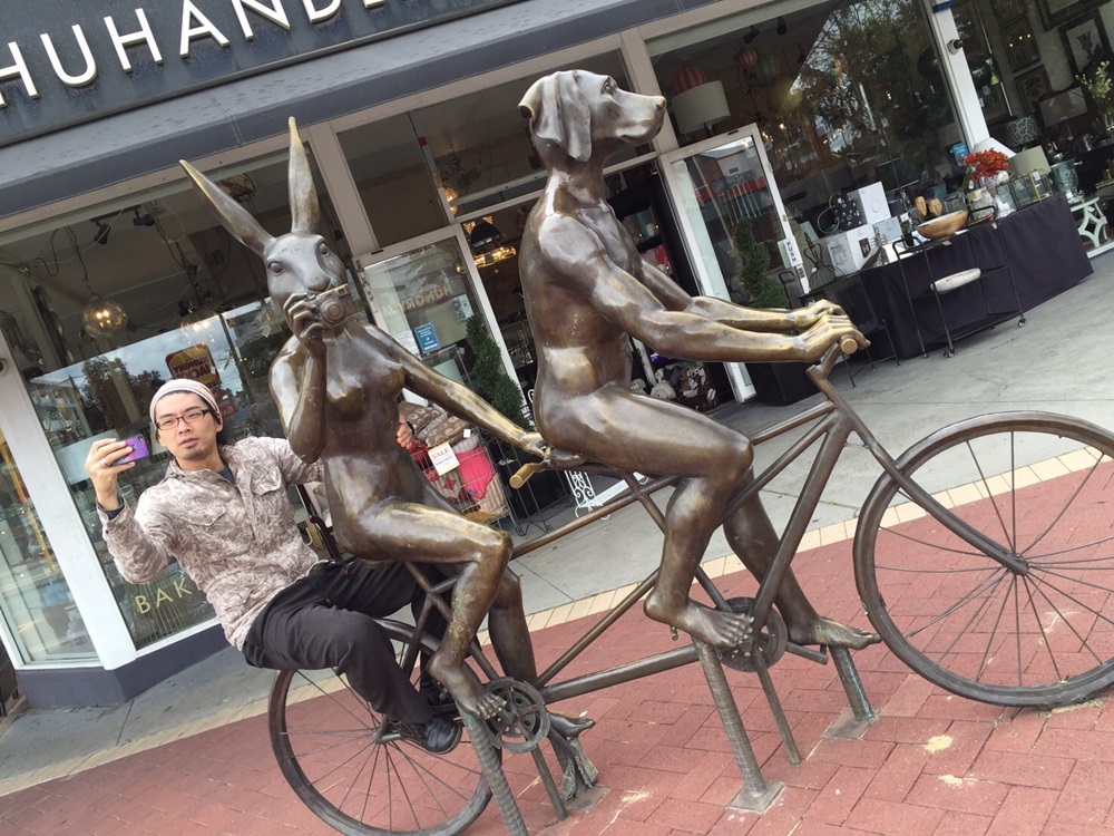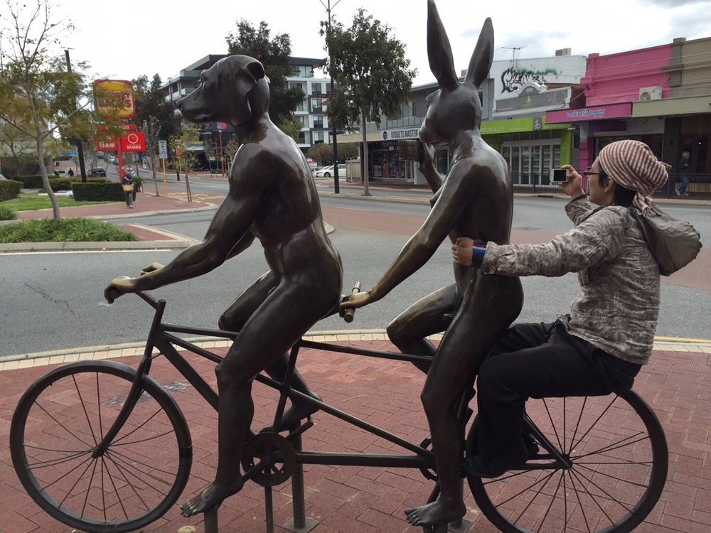 更に歩いて行くと発見した面白銅像。一緒に写真を撮っているの図