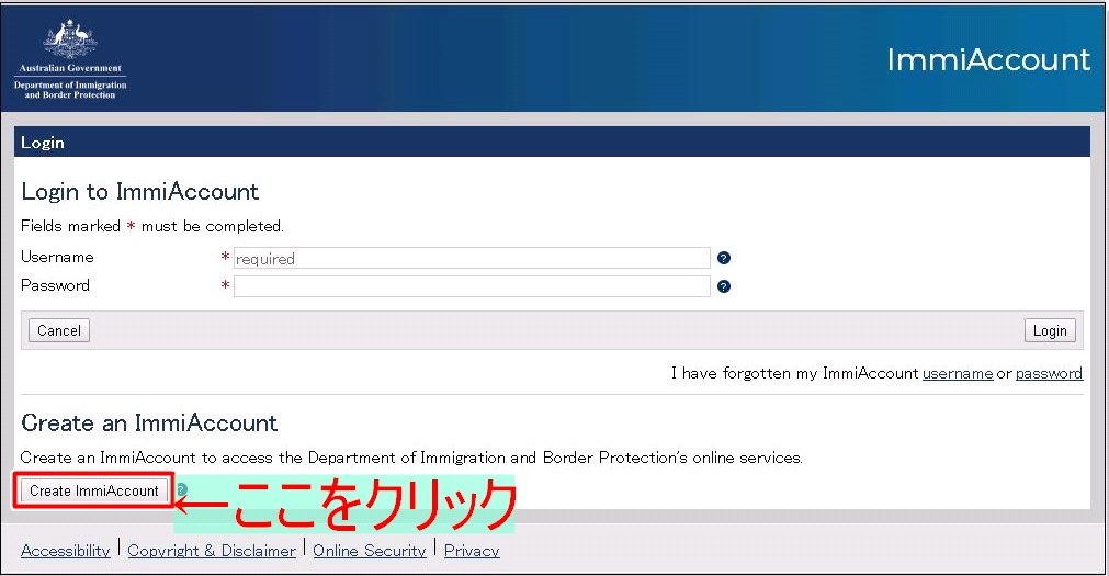 「申請ページはこちら」をからリンク先に飛ぶと↓の画面が出てくるので、画面左下の「Create ImmiAccount」をクリックしましょう。
