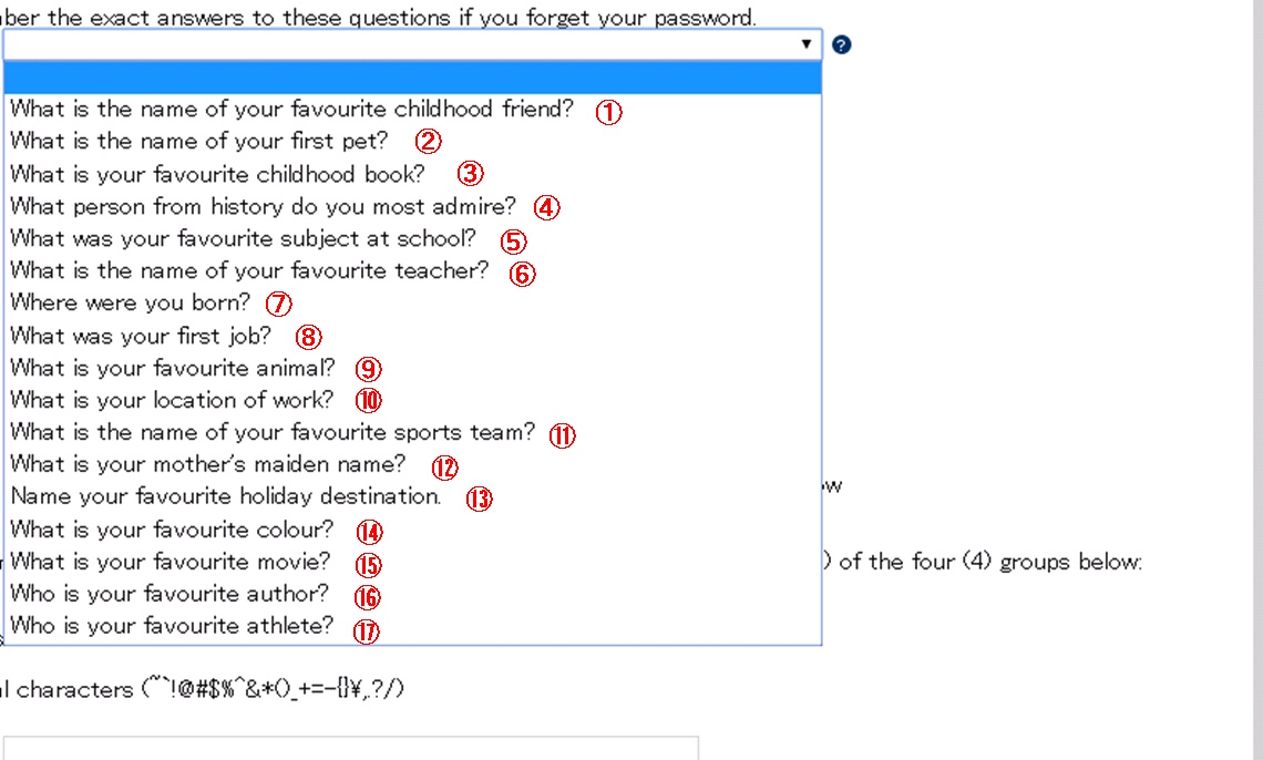 秘密の質問が「全て英語で分からない!!」という方、内容(和訳)はこちら↓