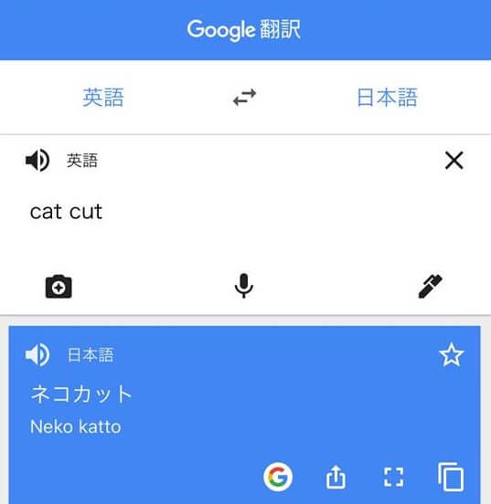 「英語⇒日本語」の翻訳にして「cat cut」と入力してみてください。