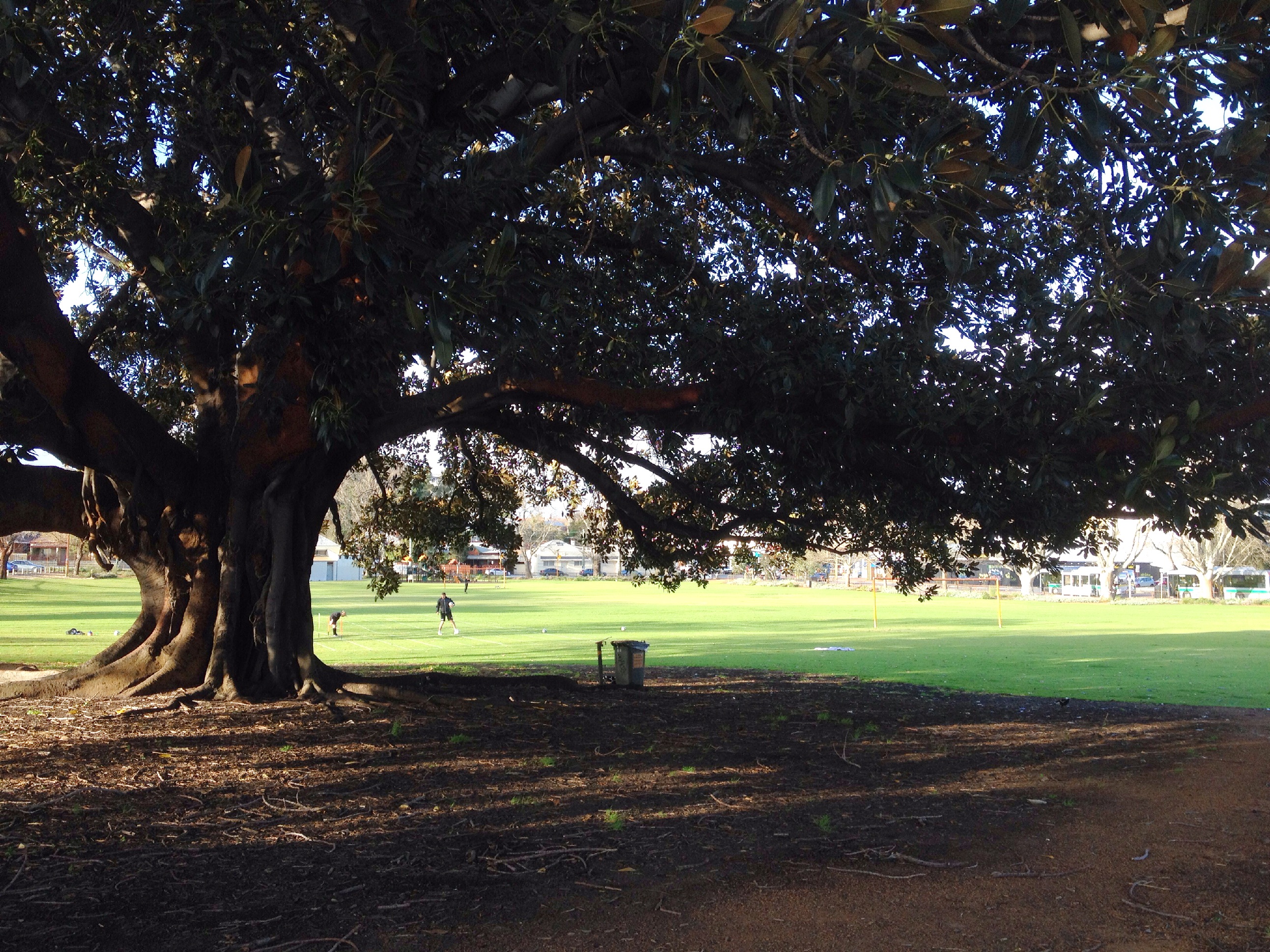 宿の目の前にある広場。どこもかしこも木がでっかい!!